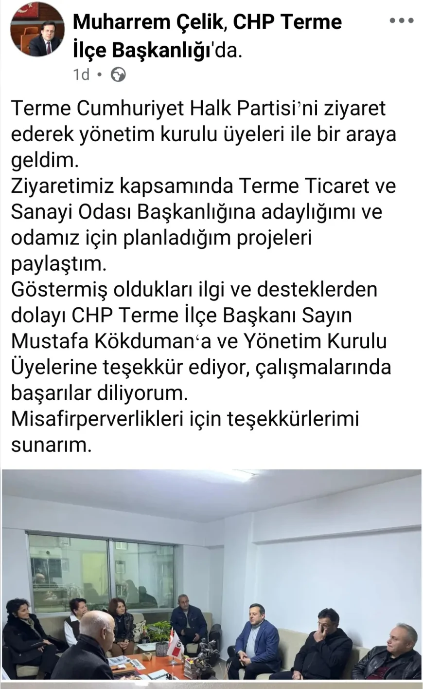 Terme Ticaret ve Sanayi Odası Başkan Adayı Muharrem Çelik seçim çalışmaları çerçevesinde CHP Terme İlçe Başkanlığını ziyaret ederek İlçe Başkanı Mustafa Kökduman ve ilçe teşkilatıyla bir araya geldi. Görüşmede, yaklaşan oda seçimleri süreci ve Terme’nin ekonomik yapısı masaya yatırıldı.