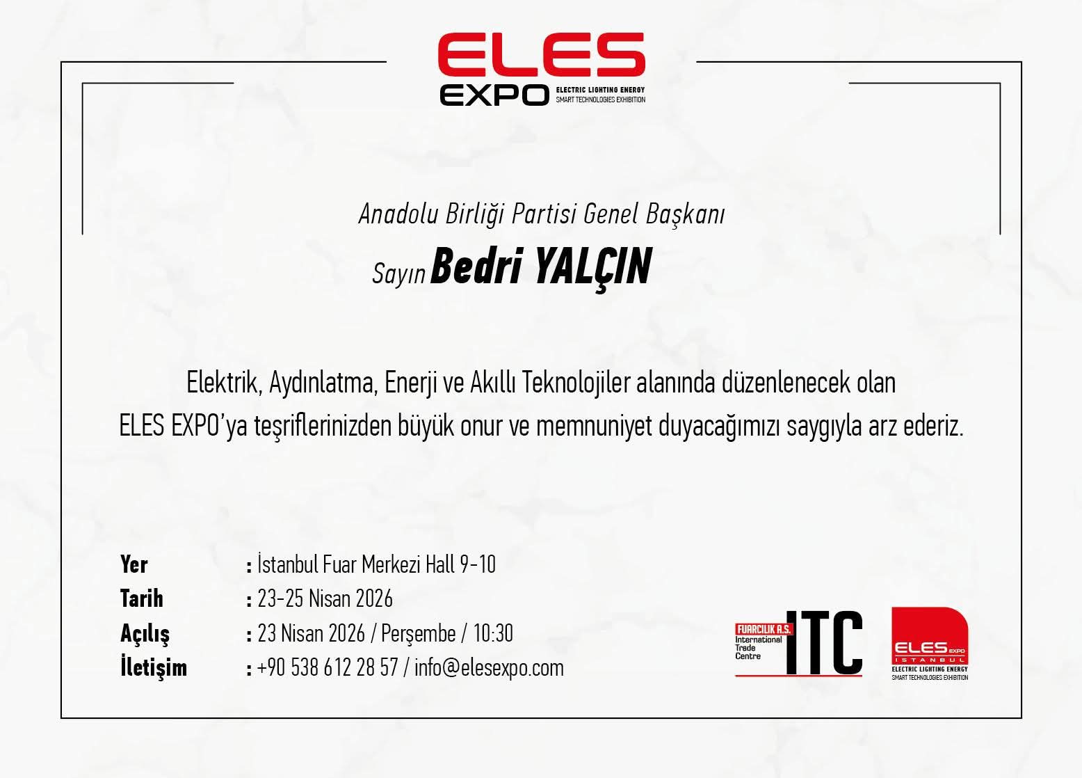 Bu kapsamda, Bedri Yalçın liderliğindeki Anadolu Birliği Partisi, ELES Expo 2026’ya davet edilen tek siyasi parti olarak dikkat çekti.